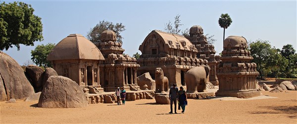 Les five Rathas (Pancha Ratha), ensemble de cinq temples monolithiques (VIème au VIIIème siècle) en forme de chars de procession nous laissent une grande impression. Ils ont été excavés d’une petite colline descendant en pente douce vers le village. Le terme ratha signifie chariot. Chaque temple est dédié à une divinité du panthéon indien : Brahma, Vishnu, Shiva, Indra, Durga. Ils étaient entièrement enfouis dans le sable quand les anglais en ont retrouvé la trace et ont dégagé le site.