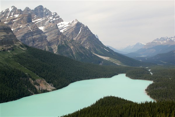 Puis nous allons au Lac Peyto que nous découvrons depuis le belvédère. Ce lac glaciaire d’un bleu turquoise est chaque année photographié par des milliers de touristes.