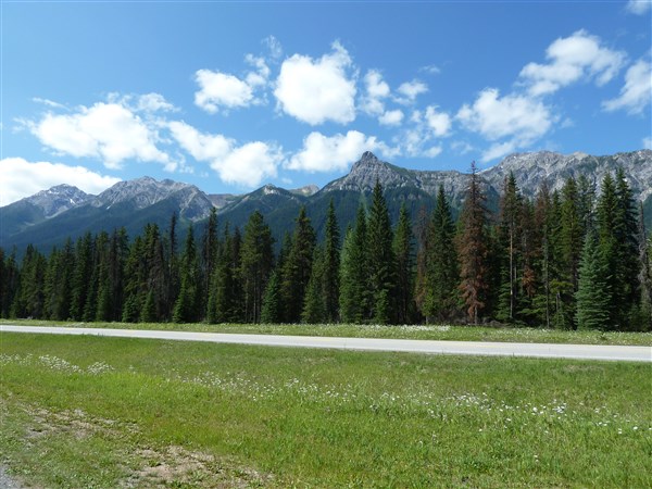Sur les conseils de Bob, notre loueur, nous prenons la route de Radium Hot Springs par la vallée de la Columbia River; très jolie route et peu de circulation. Radium Hot Spring constitue l’une des principales portes d’accès au parc national des Rocheuses. La ville abrite une importante population de mouflons du Canada. Nous y achetons notre piquenique puis nous remontons vers Lake Louise en traversant le Kootenay Park. La vallée est magnifique et nous ne regrettons pas d’avoir fait ce détour.