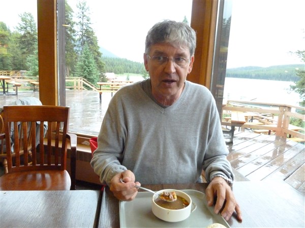 Nous reprenons donc la belle route qui suit le lit de torrent gorgé par les pluies et paraissant vouloir tout inonder. Spectacle impressionnant que celui de ces rivières en crue. Nous rentrons à Jasper où nous consacrons l’après midi à lire, écrire, classer nos photos….au sec ! Le soir nous dînons au Something Else, un resto americano, greco, italo, cajun (!!!). Souvlaki grec, pasta avec chicken cajun et vin chilien ( NDLR : le serveur était canadien !!!)