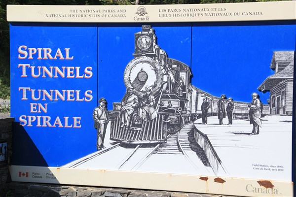 Ces tunnels, en forme d’un huit allongé, descendent la colline qui surplombe la vallée de la rivière Kicking Horse. Le point de vue est équipé de panneaux retraçant l’histoire des tunnels supérieur et inférieur du Canadian Pacific Railway. On y aperçoit également l’ouverture du tunnel inférieur dans le Mont Ogden. Ces tunnels en spirale adoucissent grandement la pente mais de nombreux problèmes se posent toujours en cet endroit où la nature règne en maître : éboulements, coulées de boue, avalanches, etc.
