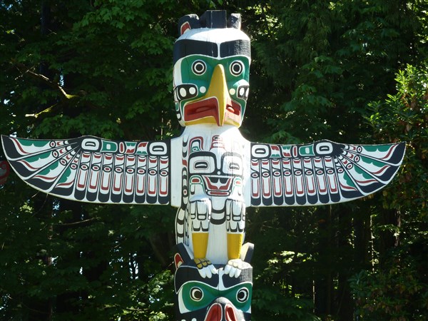 Nous suivons le Seawall, circuit vélo qui fait le tour de la péninsule. Tout au long de ses 9 km, nous découvrons de beaux points de vue sur Vancouver, ses buildings, le port et ses alentours. Un peu avant la pointe de Brockton, nous rencontrons des mâts totémiques. Il faut savoir qu’une tribu d’Amérindiens vivait à l’emplacement du parc avant qu’il ne soit fondé. En 1920, on «planta» en leur honneur ces totems colorés qui représentent les animaux-divinités dans leur culture.