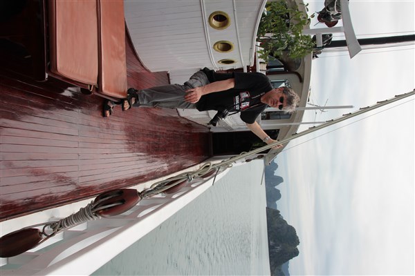 Nous appareillons sous un ciel assez gris, mais la température est très agréable. Premier repas sur le pont, table joliment décorée et excellent menu avec crevettes, poisson, riz, fruits.
