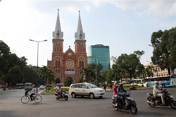 Au bout de la rue Dồng Khởi, ex-rue Catinat, célèbre au temps de la présence française, se trouvent la Cathédrale Notre-Dame et juste à coté, la Poste. La cathédrale fut construite en 1876 par les français avec des briques rouges importées de France. Elle est bâtie sur le modèle de la Cathédrale Notre-Dame à Paris, bien que de dimensions très inférieures. L’objectif de sa construction était double : donner un lieu de culte aux colons et démontrer la puissance française.