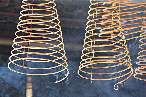 Une kyrielle de personnages en céramique décore le patio central et le portique d’entrée. Superbe ! Au plafond sont suspendus des dizaines et des dizaines de spirales d’encens qui se consument lentement et embaument la pièce. Dans toutes les cours intérieures, on a vue sur les toits et sur ces milliers de mini figurines gravées et colorées.