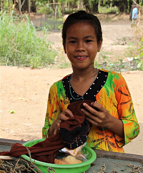 Nous rencontrons un groupe de fillettes chams qui se dépêchent de se couvrir les cheveux avec leurs foulards à notre arrivée. Elles veulent nous vendre des gâteaux qu’elles ont faits. A notre grande surprise, l’une d’elles, portant le hijab marron, parle un peu le français appris à l’école. Pour ne pas faire de jalouses, nous partirons avec un joli stock de gâteaux !