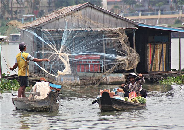 L’après midi nous partons en bateau visiter une pisciculture flottante et un village de l’ethnie Cham. Les maisons flottantes sur le Bassac servent de lieu d’habitation et de lieu d’élevage des poissons-chats asiatiques (Panga), les nasses sont situées sous la maison flottante. La région de Cho Doc produit 20% de la production piscicole du Vietnam. C’est la principale ressource de la région. Les poissons évoluent dans leur environnement naturel, ils sont nourris, puis facilement capturés. Les filets de poissons sont préparés, puis congelés et écoulés à l’étranger à un prix compétitif. Toutefois, on peut s’interroger sur la qualité de cette production exposée à la pollution du fleuve qui va en s’amplifiant au cours des années. Au Vietnam, l’élevage de poissons est plus rémunérateur que la riziculture et s’est fortement développé ces dernières décennies au détriment des campagnes. Châu Dôc est également célèbre pour la variété de ses sauces de poisson (en vietnamien : Nuoc mam).