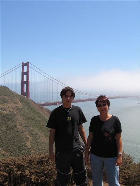 Mais avant cela nous avons enfin vu ce pont mythique ; nous l’avons même traversé, histoire de voir si à Sausalito, on trouverait à coucher. Tu oublies !! C’est friqué comme pas deux, alors retour sur SF. 5USD pour entrer dans la ville alors que la sortie était gratos (???). Nous montons sur la colline d’où la vue sur le pont et la ville doit être superbe. Hélas les brumes du Pacifique …