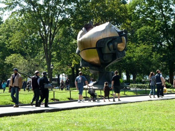 Nous prenons le métro destination la pointe sud de Manhattan et Battery Park. Ce parc se trouve au centre du Financial District entre les gratte-ciels et la rivière Hudson. Ce halo de verdure offre une vue imprenable sur la statue de la liberté. Le parc accueille aujourd’hui l’œuvre d’art de Fritz Koenig «La Sphère» placée précédemment sur le parvis du World Trade Center. Marquée par les explosions, cette sculpture abîmée témoigne de l’horreur des attentats du 11 septembre et est devenue un lieu de recueillement.