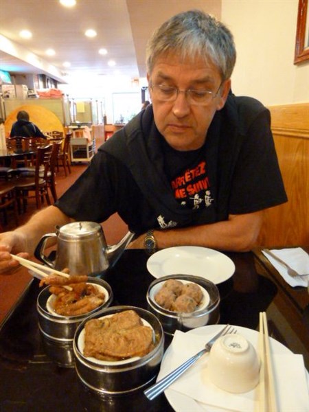 Puis direction Chinatown. A midi, grande découverte gastronomique: les «dim sum». C’était…comment…..dire…hummm…assez…étrange……inqualifiable……..je dirais même répugnant ! Sauf…sauf… si on aime les pattes de coq !!!! Le service est fait par des serveurs circulant entre les tables avec des chariots chauffants. Il en existe deux principales sortes: les chariots à la vapeur et les chariots avec plaque de cuisson. Les premiers sont chargés de petits caissons en bambou contenant les mets. Les deuxièmes s’arrêtent près des tables où ils sont appelés et les serveurs préparent le plat sous les yeux de clients.