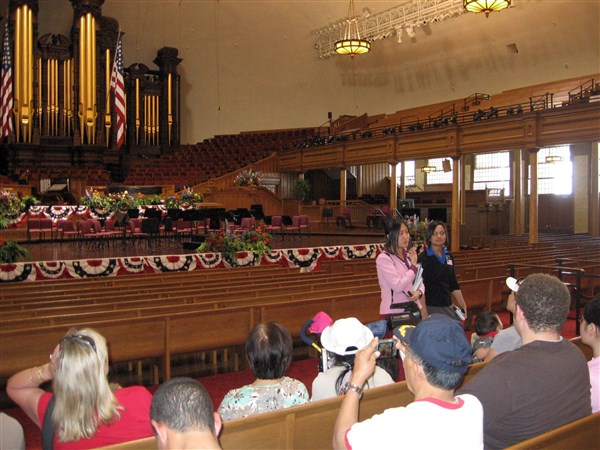 A peine entrés dans Temple Square, nous sommes abordés par des “Saints des derniers jours”. Ce sont de jeunes mormons qui viennent du monde entier et qui offrent des visites guidées gratuites, deux par deux, pour parler de leur foi et ce, en plusieurs langues. On entre dans le Tabernacle (le temple ne se visite pas si vous n’êtes pas mormon; ça tombe bien…. Vous l’aurez compris…on n’est pas mormon!) Dans le Tabernacle, baratin fait par des filles presque en transe….!