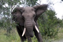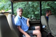 Un peu plus tard un éléphant assez menaçant empêchait le passage de notre 4×4. Le guide s’est arrêté à bonne distance et à fait rugir le moteur plusieurs fois pour le faire reculer, ce qu’il fit peu à peu. Impressionnant ! Nous n’étions pas très rassurés et ce n’est qu’après un coup d’accélérateur donné pour nous éloigner rapidement que les conversations reprirent dans la voiture.