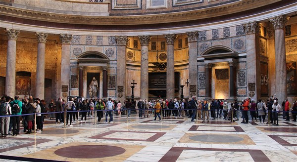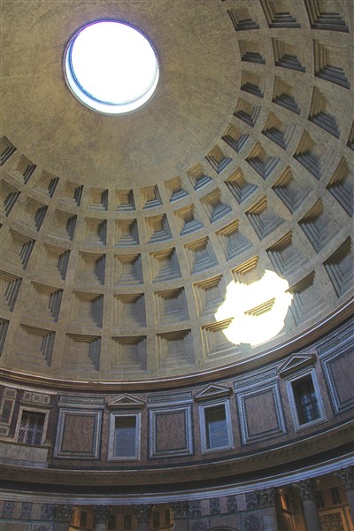 Le tambour cylindrique est traversé par des briques et des arcs pour supporter la plus massive coupole jamais réalisée pendant l’Antiquité ! Sa forme intérieure, en 5 rangées de caissons, se termine par une vaste ouverture centrale (9 m de diamètre) qui éclaire l’ensemble. Étrangement, on raconte que la pluie ne rentre jamais dans le Panthéon.