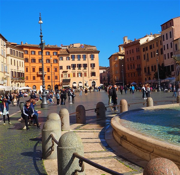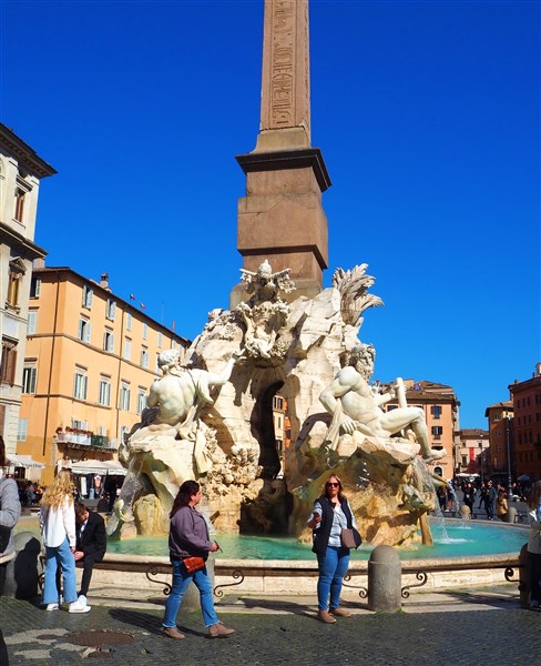 Au centre de la place se trouve la Fontaine des Quatre Fleuves. Cette réalisation sculpturale, chef-d’œuvre du baroque, célèbre quatre fleuves majeurs : le Danube, le Gange, le Rio de la Plata et le Nil.