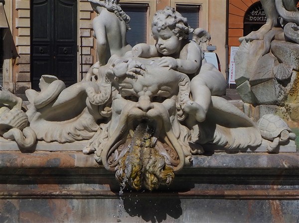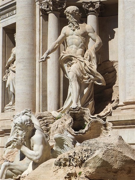 La Fontaine de Trevi fut réalisée par Niccolo Salvi. On y voit Neptune qui domine des chevaux marins, guidés par des tritons, sortes de sirènes au masculin. Ce qui est représenté ici, c’est donc la puissance des océans et non pas l’eau douce de la fontaine.