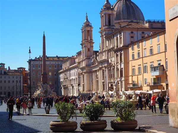 Piazza Navona: Une place splendide et mythique! Romains et touristes aiment se promener sur ce qui fut autrefois le stade de l’empereur Domitien. Ils s’installent autour des fontaines ou des cafés et se laissent charmer par les musiciens.