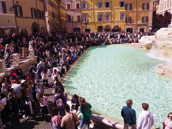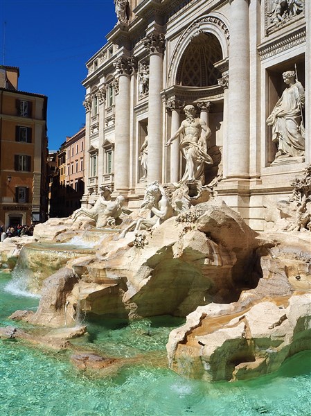 Élégamment appuyés sur la façade du Palazzo Poli, statues et bas-reliefs semblent être perchés au-dessus de masses rocheuses, d’où l’eau jaillit de tous côtés.
