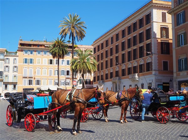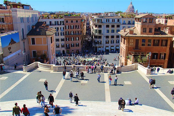La place est bordée de beaux immeubles aux couleurs chaudes. Mais ce qui fait la réputation de la place d’Espagne, est la perspective de la fontaine de la Barcaccia à l’église de la Trinité des Monts, reliée par un très bel escalier construit au XVIIIème siècle.