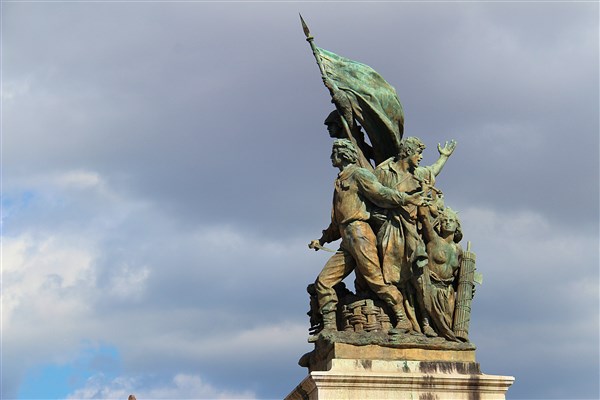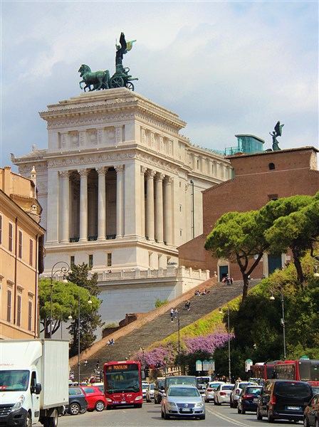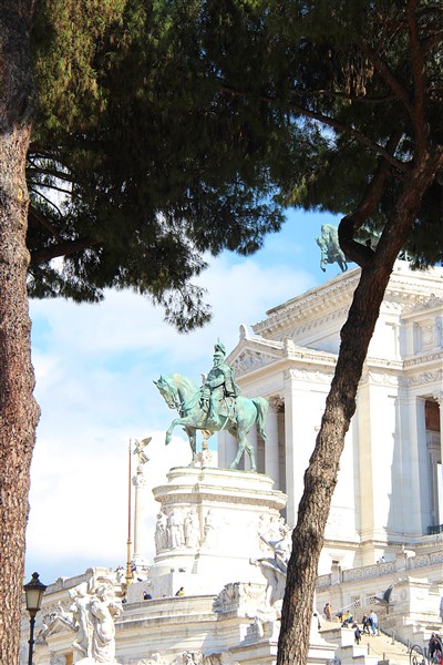 La piazza Venezia est dominée, voire écrasée, par le Vittoriano, monument dédié à Victor-Emmanuel II, roi d’Italie après l’unification du pays. Cet édifice grandiloquent est affublé de divers surnoms : la machine à écrire, mais aussi le dentier ou la pièce montée. De nombreux éléments sont là pour symboliser l’Italie réunifiée comme les seize statues du fronton pour les régions et les fontaines pour les deux mers baignant la Botte.