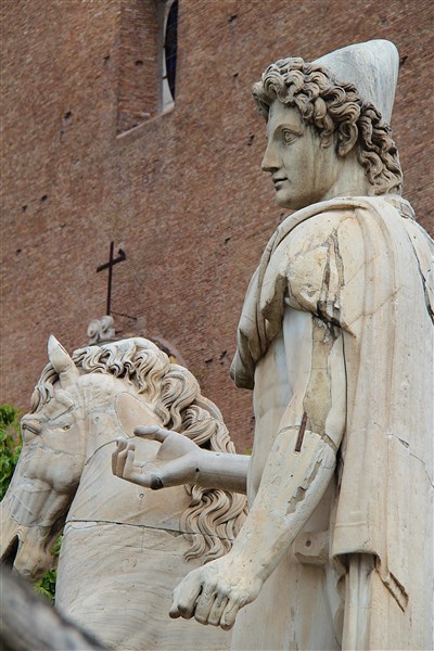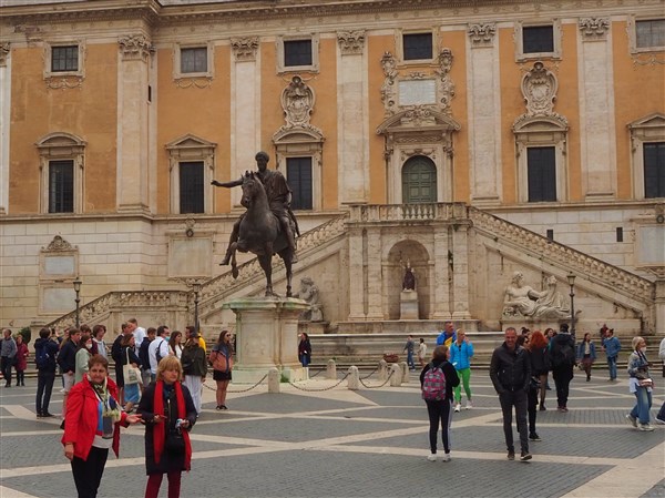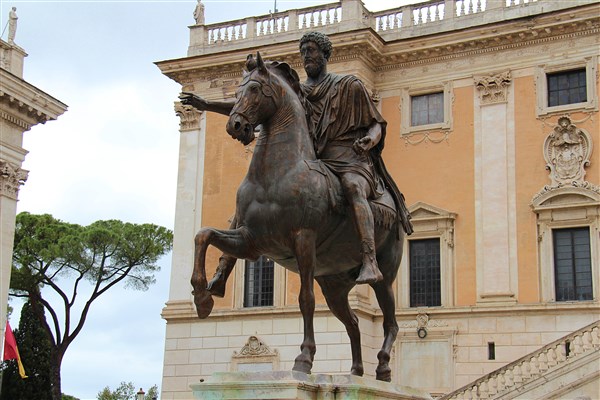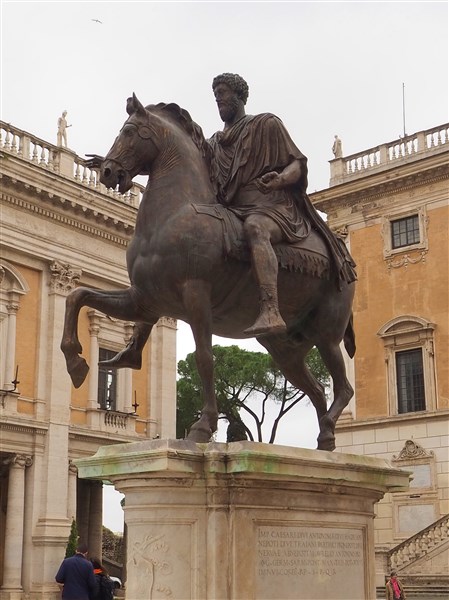 Au centre de la place se trouve la statue équestre de l’empereur romain Marc Aurèle. L’empereur romain est représenté comme un homme puissant, victorieux et confiant.