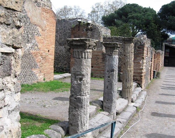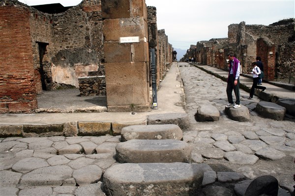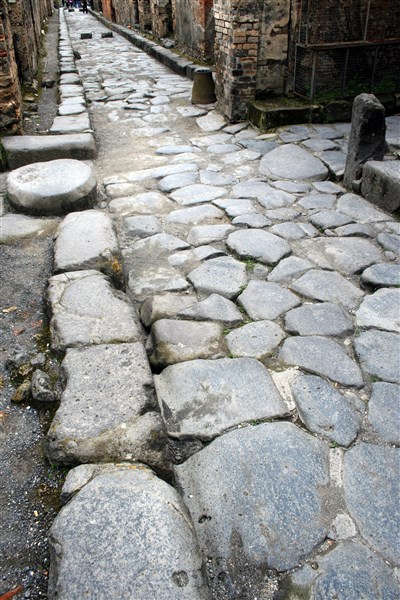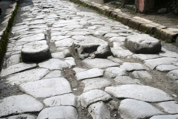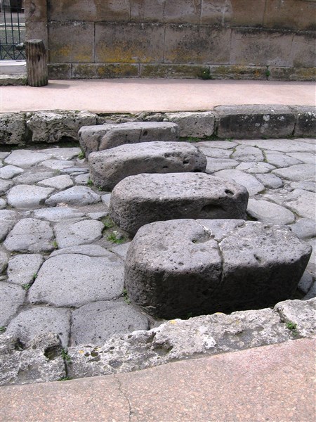 Les rues de Pompei possèdent toutes des passages piétons surélevés qui permettaient aux passants de ne pas se mouiller les pieds en traversant pendant les fortes pluies mais aussi aux chars de passer. C’est l’une des curiosités du site archéologique de Pompéi !
