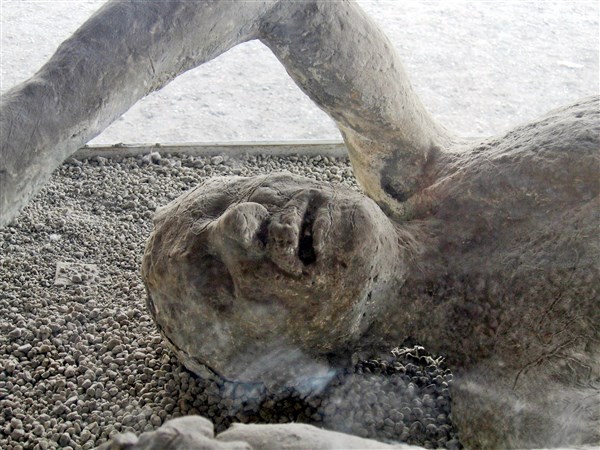 L’éruption du Vésuve en l’An 79, ensevelit la ville de Pompéi sous 5 à 6 mètres de pluies de cendres et de pierres ponces, faisant plusieurs milliers de morts. Tout s’est éteint à tout jamais en deux jours…!
