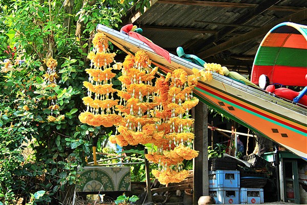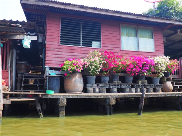 Pendant trois heures notre batelier nous a entrainé dans un labyrinthe aquatique, nous avons découvert des maisons en bois sur pilotis, des bicoques bringuebalantes au toit de tôle, mais aussi de belles demeures en teck, des temples de poche, des petits marchés flottants, une ferme à orchidées…