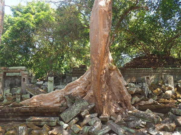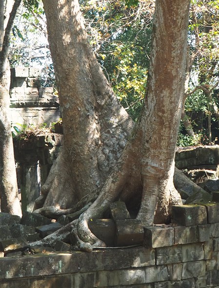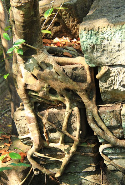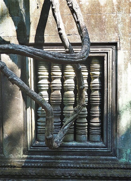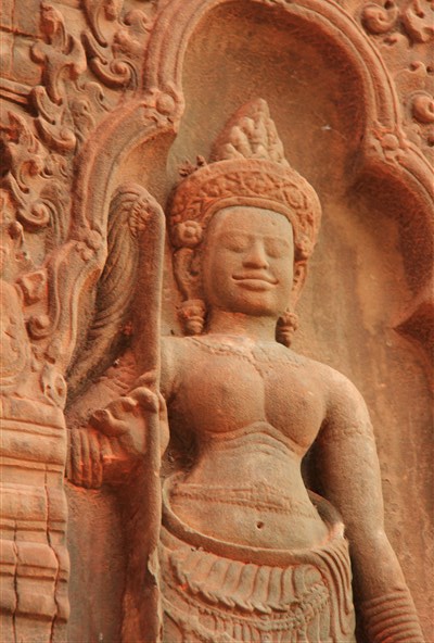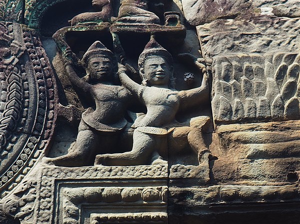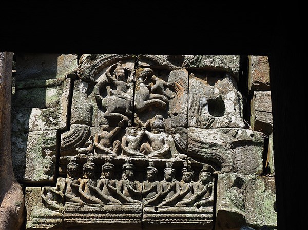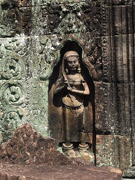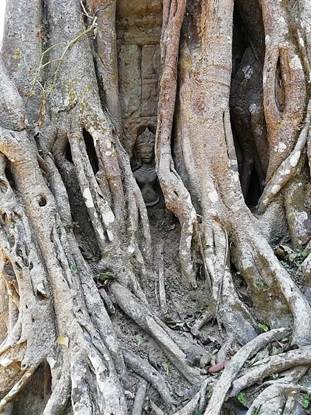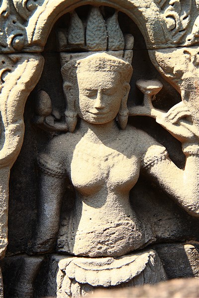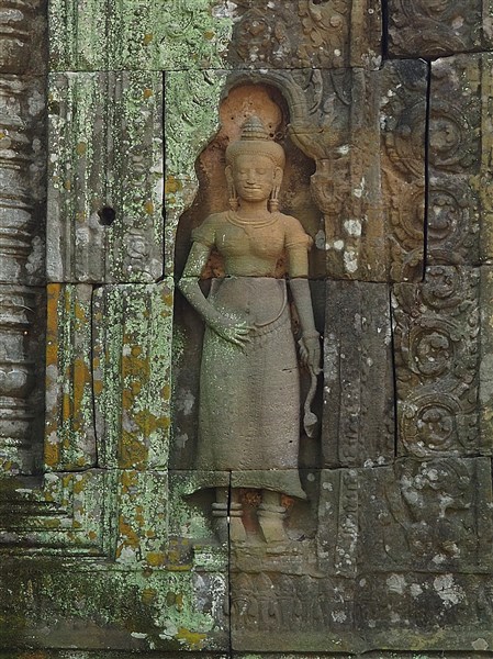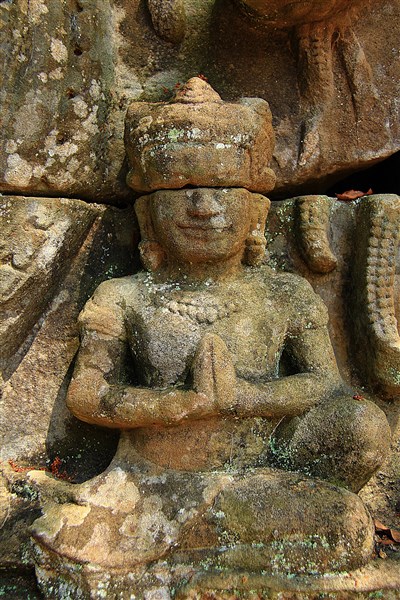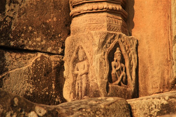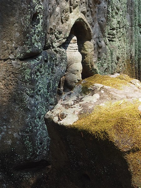 Sur les poutres, les frontons, les linteaux, les façades des galeries ou sur les blocs de grès qui s’éparpillent un peu partout, les bas-reliefs hindouistes ou bouddhistes se démarquent parmi les racines et les mousses des algues.