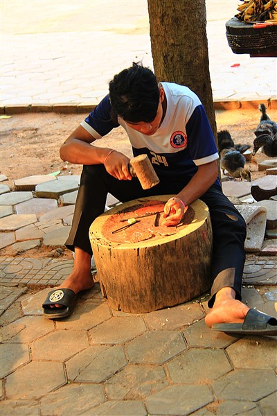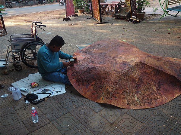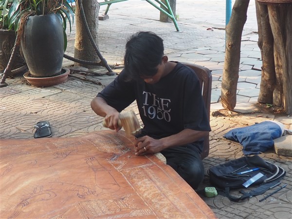 Les enfants cambodgiens sont accueillis la moitié de la journée dans ce centre pour y être formé et nourri et l’autre moitié de la journée, ils vont à l’école. Leur travail est remarquable! Ils reproduisent les apsaras, les singes, les visages avec délicatesse et précision. Nous sommes vraiment bluffés par le travail de ces enfants et de leur professeur.