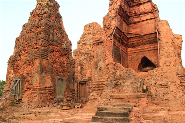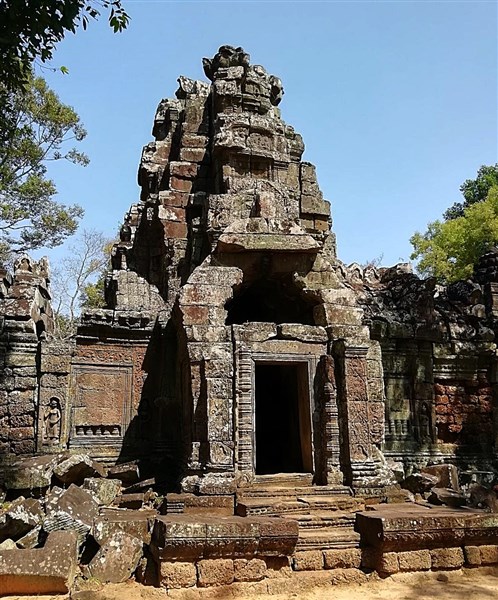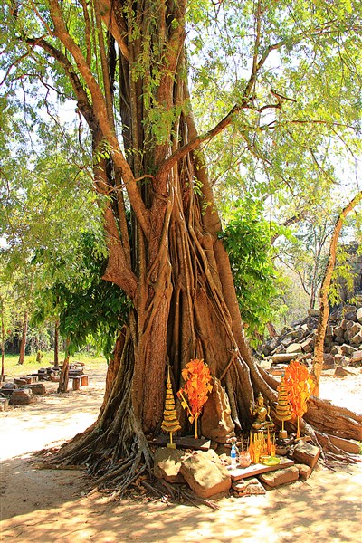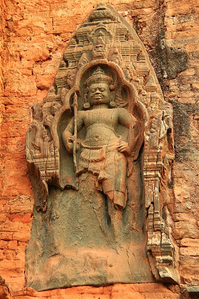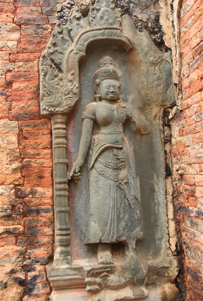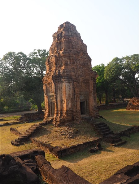Yasovarman Ier, fondateur de la première cité d’Angkor, fit construire ces quatre tours en brique. Elles se tenaient sur un îlot au milieu d’un grand réservoir qui est devenu aujourd’hui une rizière. Sur les différents étages, on aperçoit des sculptures en grès.