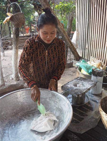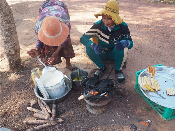 On y rencontre surtout les femmes qui fabriquent des gâteaux dans du bambou, font des gaufres à même le sol et fabriquent des nouilles de riz qui serviront de base au traditionnel et délicieux Nom Bah Chok que nous dégusterons sur place. C’est très bon!