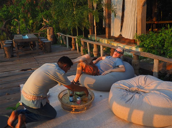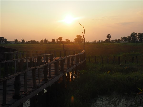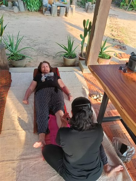 Nos hôtes nous proposent un massage Khmer des jambes et du dos. Cela se passe dans un joli jardin au coucher de soleil. C’est vigoureux et relaxant, Gérard à un gros bleu au genou le lendemain!