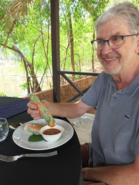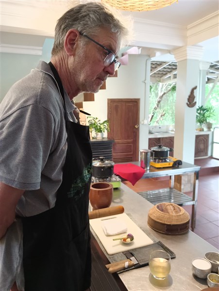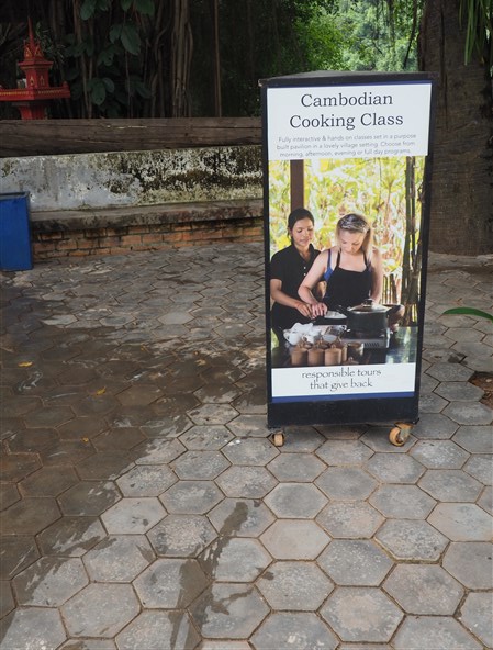 Le tuk tuk nous emmène à la Cambodian Cooking Class où la cheffe nous attends. Nous enfilons les tabliers et le cours commence. Notre guide se charge des photos pendant que nous suivons les consignes pour couper, trancher, éplucher et cuisiner. C’est ludique!