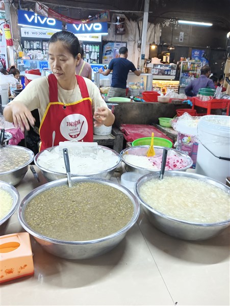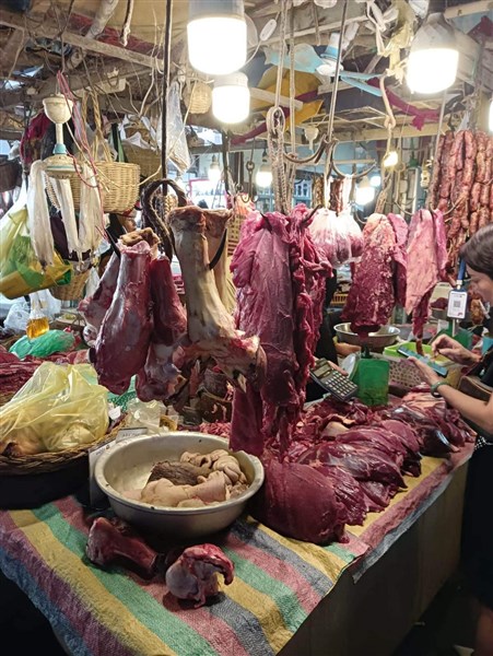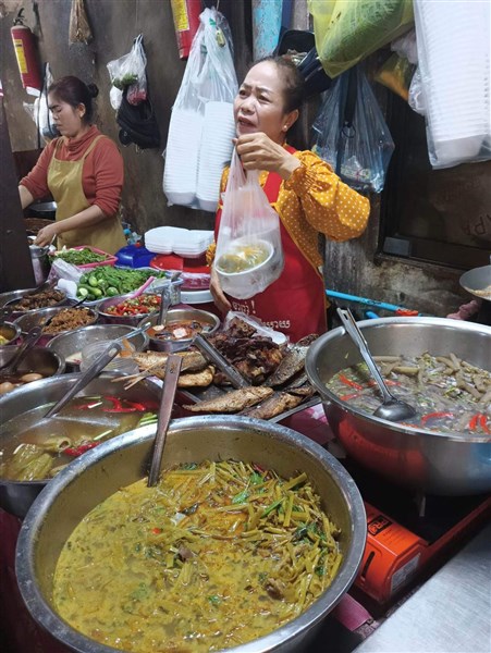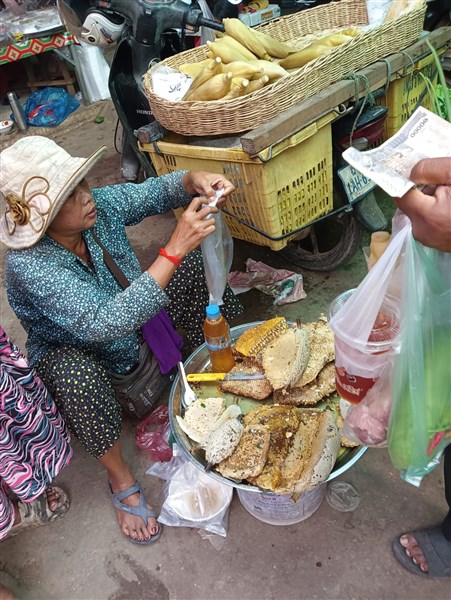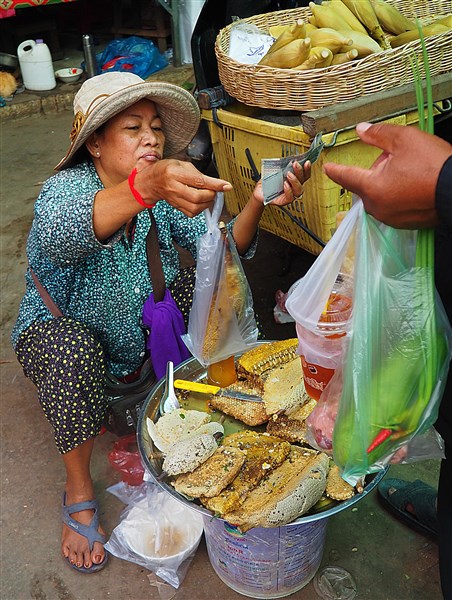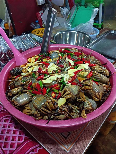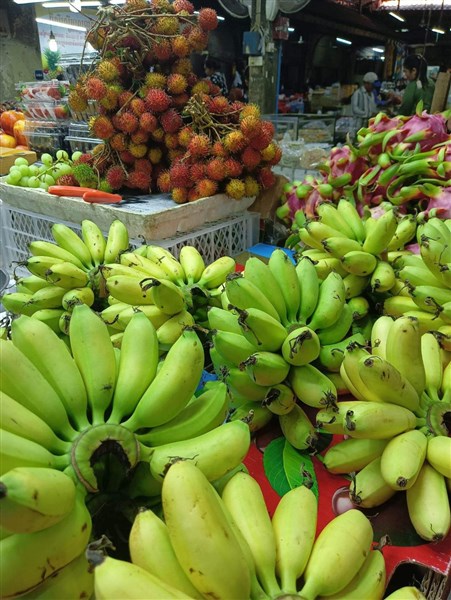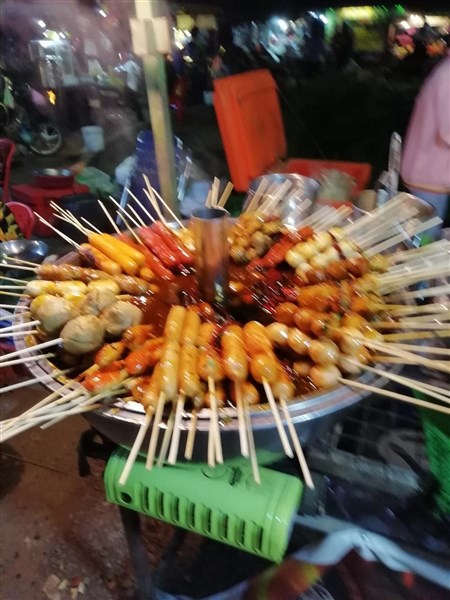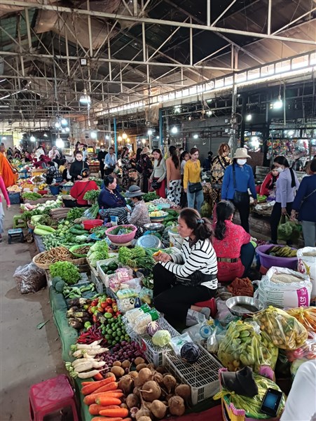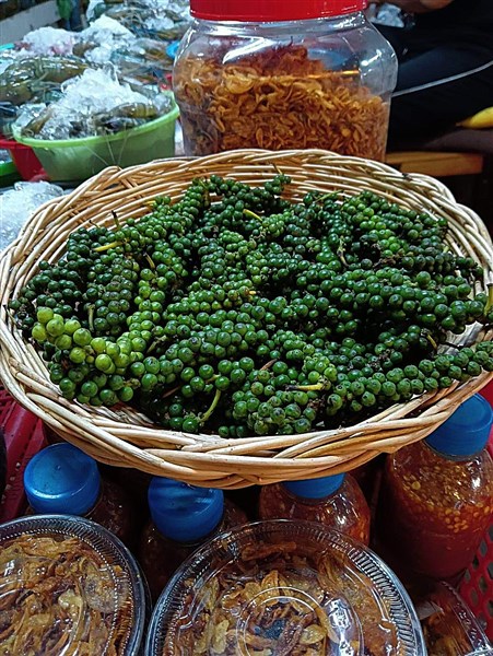 Ce marché est une excellente occasion de voir de tout, des fruits, des légumes, de la viande, des poissons crevettes, calamars, des pâtes crues ou cuites . De nombreuses femmes cuisinent dans un espace extrêmement réduit mais c’est surtout pour les locaux. Les épices…….dont le amok et aussi du poivre.