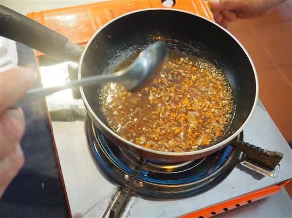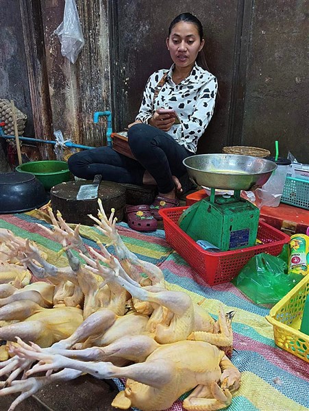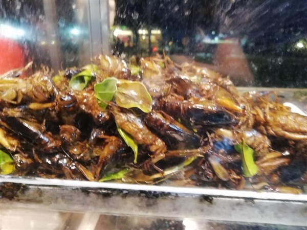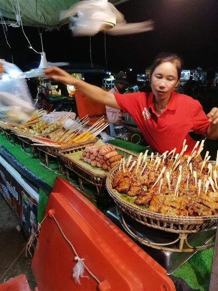 Notre guide achète des crevettes, des légumes, du poulet, des bananes. Ouf, pas d’insectes au menu!