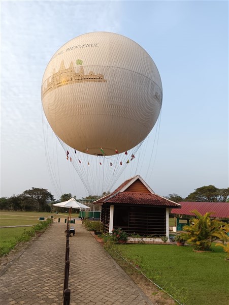 Au coucher de soleil, nous allons faire un petit tour en ballon captif pour admirer le temple d’Angkor Wat. Le ballon monte à 100 mètres mais, grosse déception, le temple est très loin!