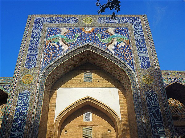 A l’est du bassin, la madrasa Nadir-Divanbeg se distingue par les deux immenses sémourgues (oiseaux immortels) qui ornent son portail. Ces oiseaux fantastiques au plumage bleu et vert tiennent une biche dans leurs serres.