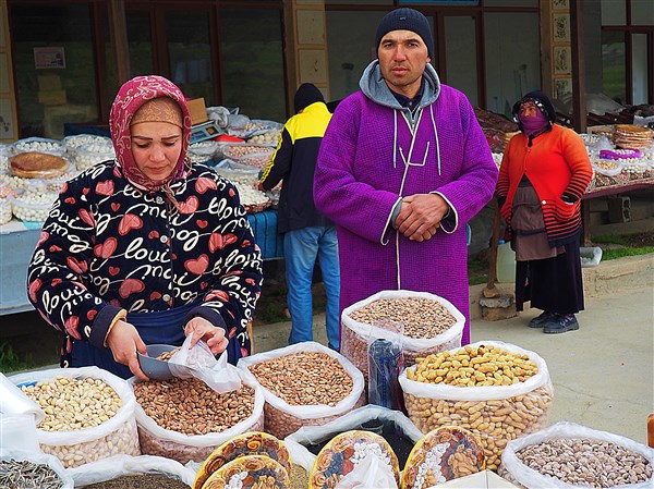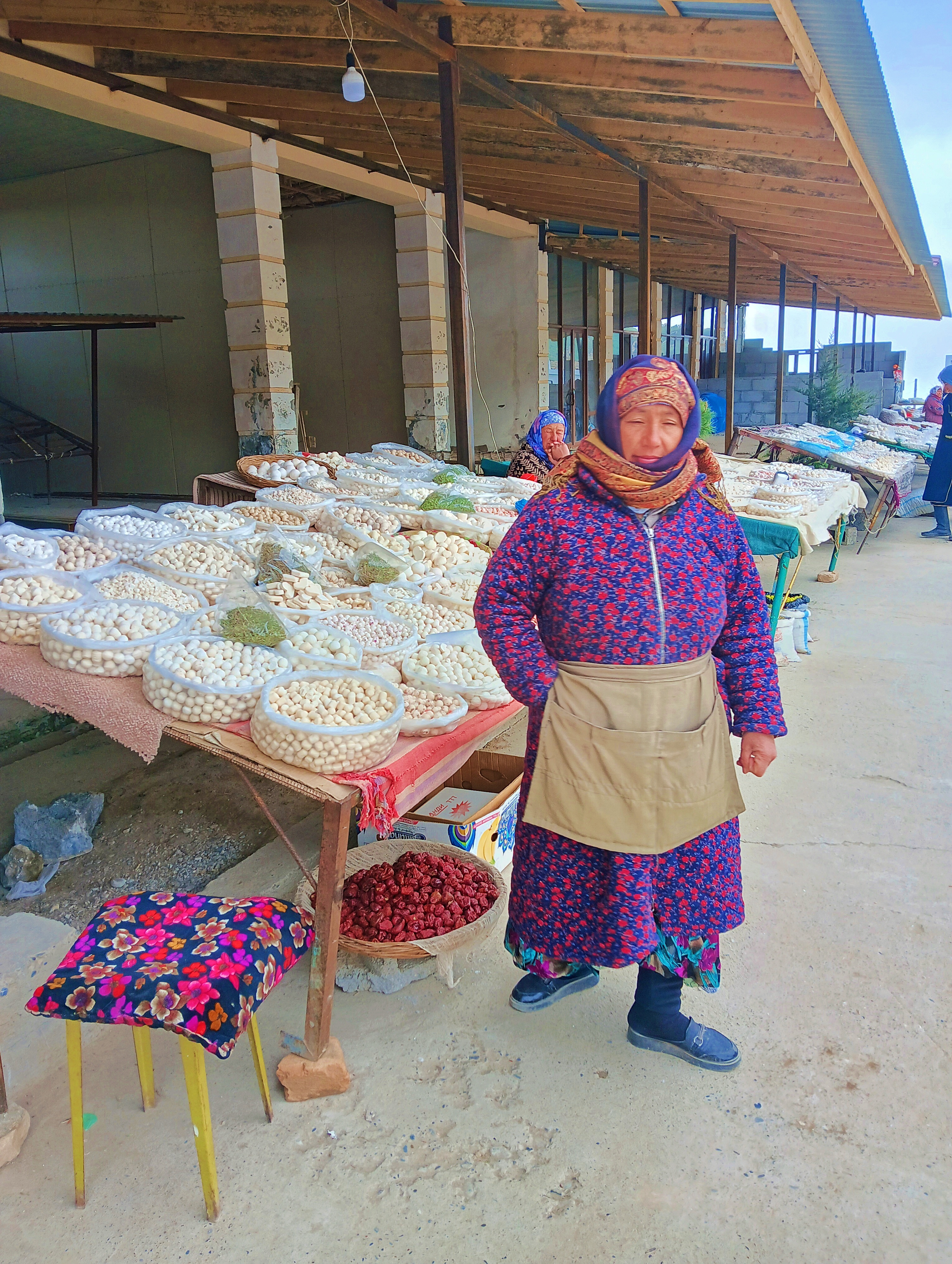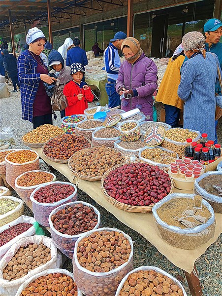 Arrivés au col nous nous baladons au milieu des étals du marché aux épices et aux fruits secs, face au panorama magnifique sur les monts Zarafshan.