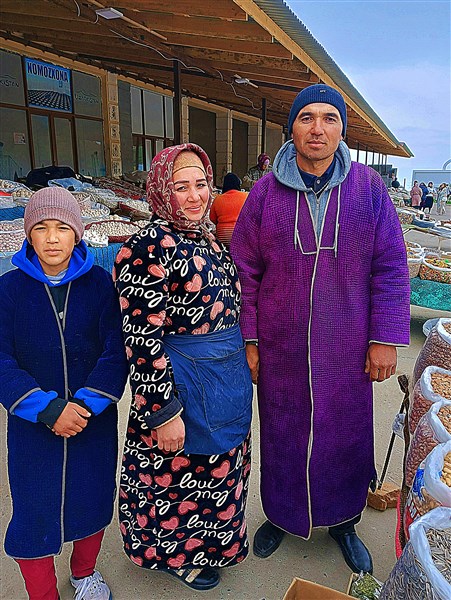 Nous quittons Chakhrisabz pour aller à Samarcande en empruntant une route de montagne, interdite aux bus, qui nous mène au col de Takhtakaratcha (1675 m) où est installé un petit marché. Il fait frisquet ce matin, seulement 10 degrés!