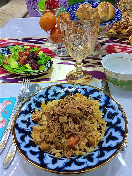 Le plov est un plat rependu à travers l’Asie centrale, mais il est d’origine ouzbèke. Ce plat qui se partage dans une grande assiette est fait de riz, oignons, carottes et viande frits, cuits dans la graisse de mouton.