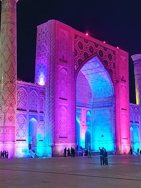 A la nuit tombée, elle devient magique, lorsque les silhouettes illuminées des trois médersas monumentales couvertes de faïence bleue et or et du magnifique mausolée Gour Emir se détachent sur le ciel noir.
