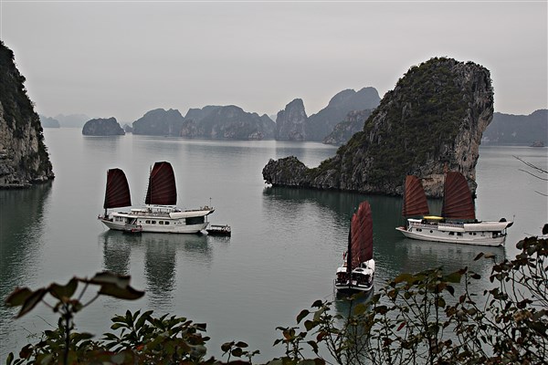 Bonne surprise au réveil, la pluie a cessé et le ciel est à peu près dégagé. Nous avons droit à un petit déjeuner vietnamien : Pho au poulet (surprenant le matin pour nos estomacs, mais on y goûte courageusement) suivi heureusement de toast, œufs brouillées et confiture. Malgré le ciel gris et bas, le paysage est fantastique. Et même cette atmosphère cotonneuse n’arrive pas à cacher les eaux de jade d’où émergent des pitons garnis de plantes tropicales. Lire la suite