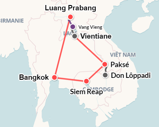 Bangkok au fil de l’eau, le Laos du nord au sud, le Cambodge entre temples oubliés et Tonlé Sap.